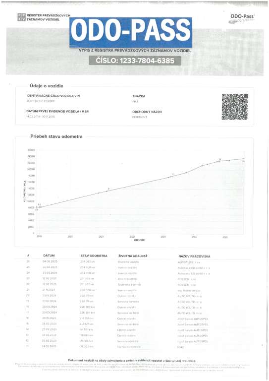 VIN: 3C4PFBCY2ET168906. Vozidlo dovezené z Talianska. Skelet vozidla je nehavarovaný. Originálne najazdené kilometre si môžete overiť aj u ktoréhokoľvek oficiálneho predajcu FIAT. Pri jazde na aute nič nebúcha ani nevibruje, jazda je plynulá. Nápravy sú pevné, pri jazde nie sú žiadne vibrácie. Pohon 4x4 funguje úplne bez problémov, vyskúšať si ho môžete v teréne pri našom areály. Interiér vozidla priestranný aj pre väčšiu rodinu - 7 sedadiel. Ľahko udržovateľný kožený povrch sedadiel. Variabilné sedadlá. Na vozidle sú namontované letné pneumatiky. Ku vozidlu je vystavený výpis zo štátneho Registra prevádzkových záznamov vozidiel - ODO-PASS, ktorý zobrazuje históriu najazdených kilometrov vozidla! Posledná servisná prehliadka: 10.4.2025 pri 233 500 km + REPAS PREVODOVKY. Na vozidlo je možný úver aj bez akontácie! Vybavíme ho priamo u nás na počkanie, výšku akontácie a splátky Si nastavíte sami. VIN: 3C4PFBCY2ET168906. AUTOALLES: najväčší slovenský autobazár, už od roku 1990, doživotná záruka na pôvod vozidla s garanciou vrátenia peňazí. Tešíme sa na vašu návštevu.